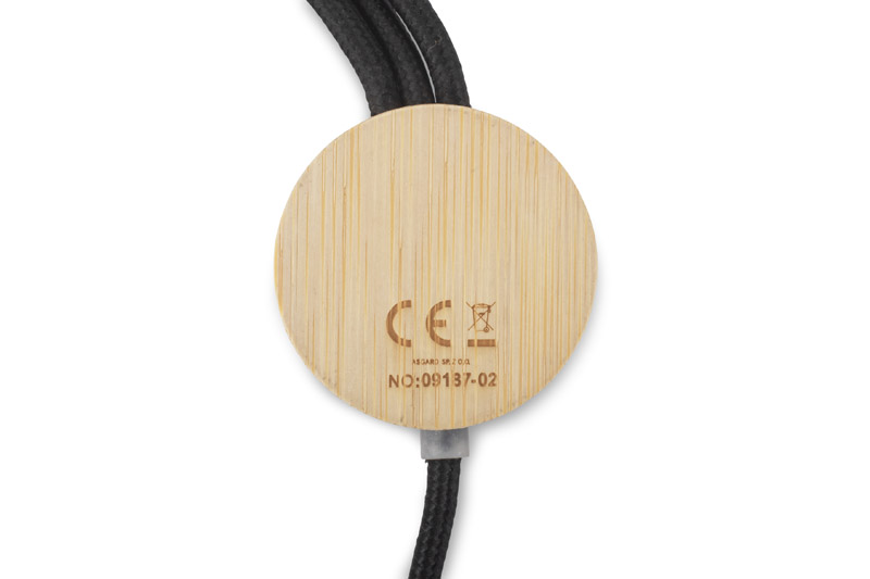 Equipped with four connectors: USB-A, 2x USB-C, micro USB and Lightning, and allows you to charge various devices with up to 15W (5V/3A). The cable is covered with a durable braided sleeve, and a round piece with a bamboo finish hides the branding panel - once engraved, the logo is illuminated with a white LED light.