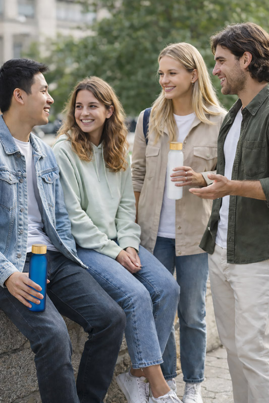 The 500 ml NILLO bottle is made of frosted recycled glass. Its semi-transparent surface and bamboo cap give it a modern, subdued look. The classic threaded cap ensures a tight seal and the simple form makes the bottle convenient for everyday use. It will be perfect for storing water, juices or infusions. It is an elegant reusable gadget with the possibility of labelling.