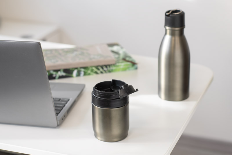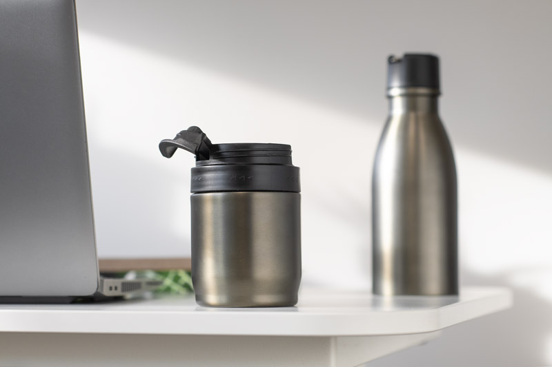 The DRINNO thermal bottle made of stainless steel consists of two elements (compartments) that can be separated and used independently. The upper part is a thermal bottle with a screw cap and a foldable handle (500 ml), while the lower part is a detachable thermal mug with a snap-lock lid (approx. 200 ml). The bottle keeps beverages hot or cold for up to 10 hours, making it perfect for work, travel, or everyday use. The complete set offers a functional solution for storing hot and cold drinks – also ideal as a practical promotional gift.