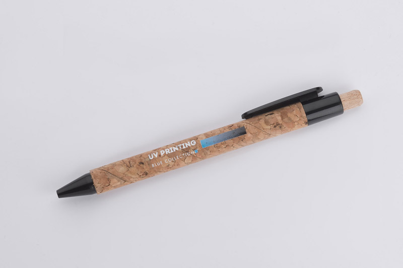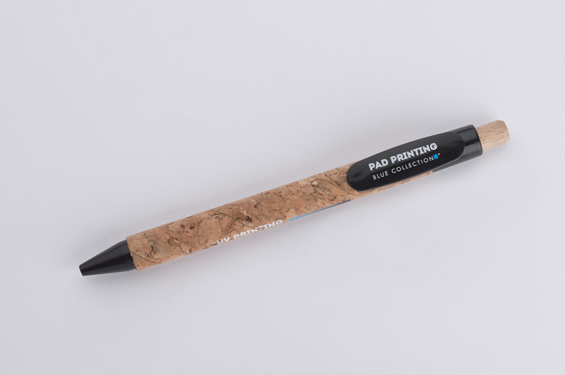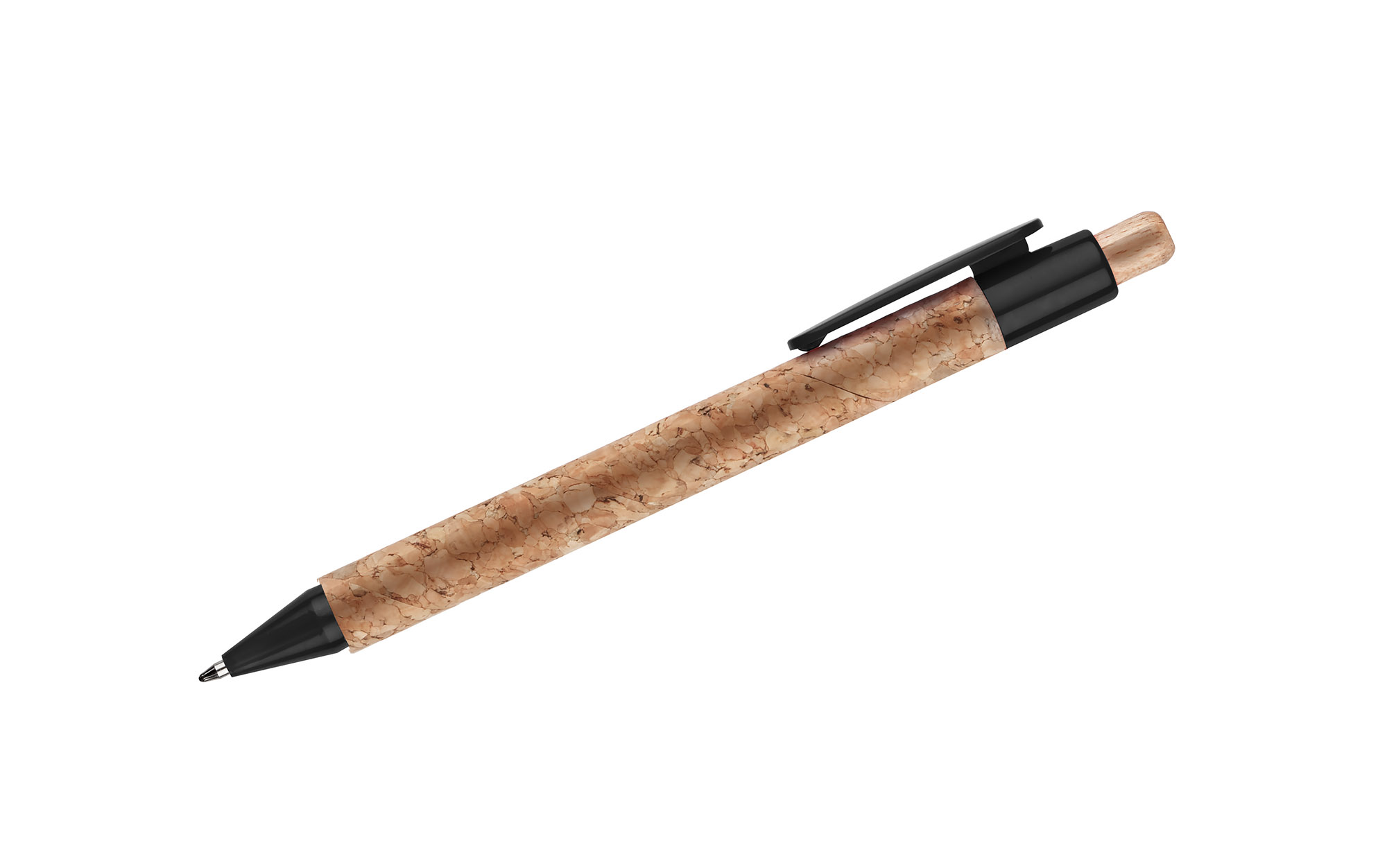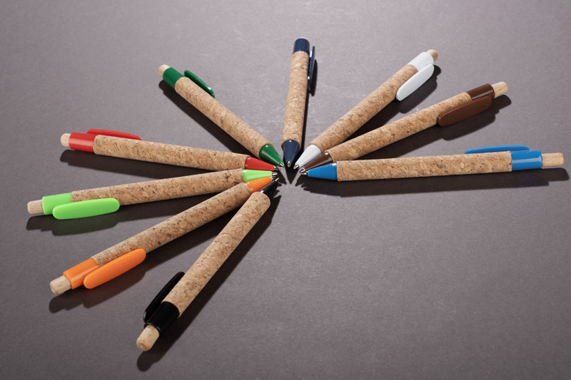 The KORTE pen refers with its looks to the idea of recycling. The barrel is made of natural cork and the button is made of wood. Plastic finishes in vivid colours add charm. Blue refill.