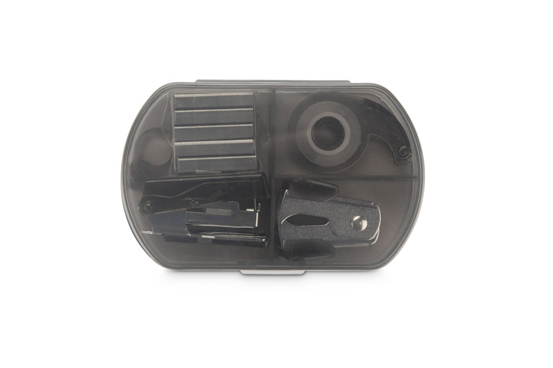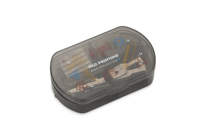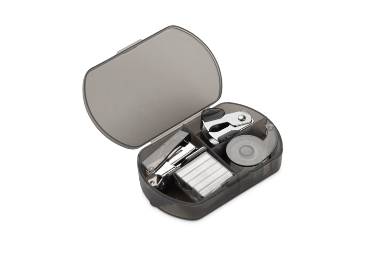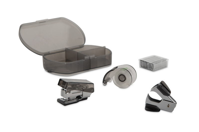 The DOCSY office kit is a compact solution containing the most necessary accessories: mini stapler, mini hole punch, adhesive tape and a supply of staples - all enclosed in a handy plastic case. Ideal for use in the field, on a small desk or as a practical promotional gadget for the office and education sector.