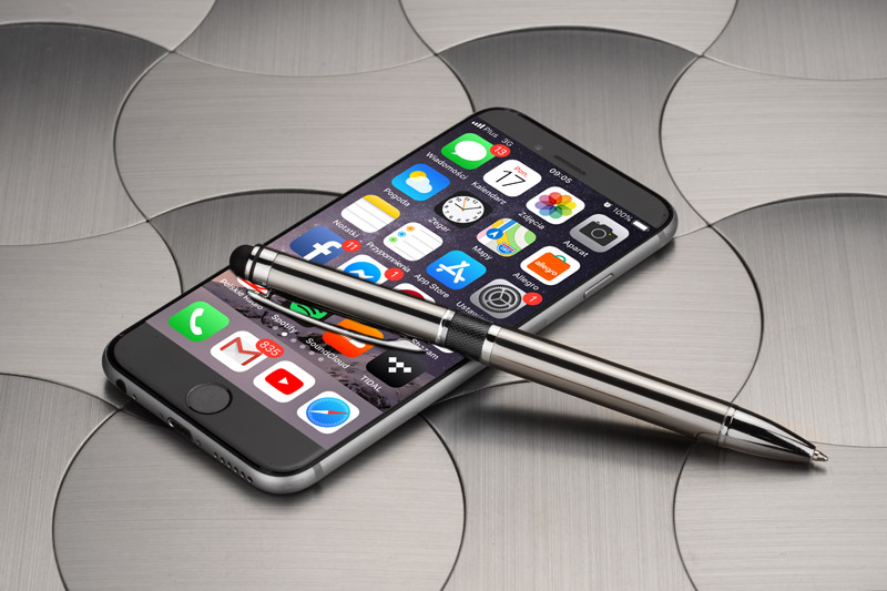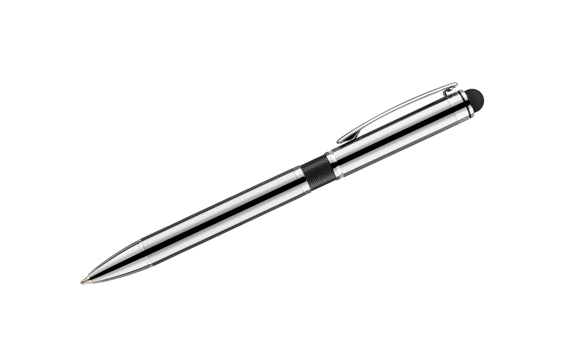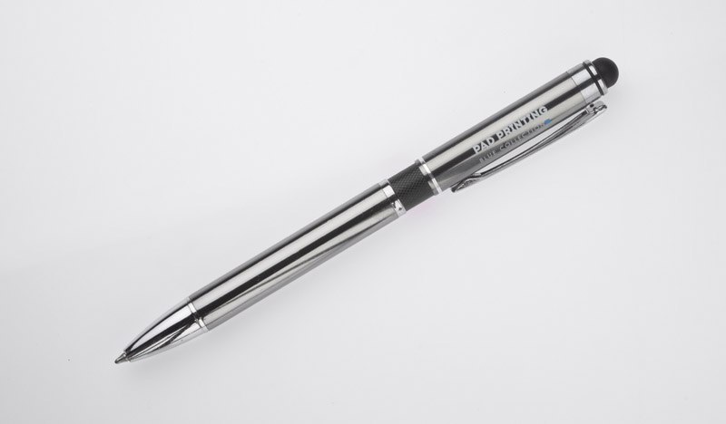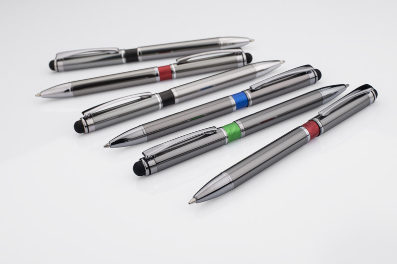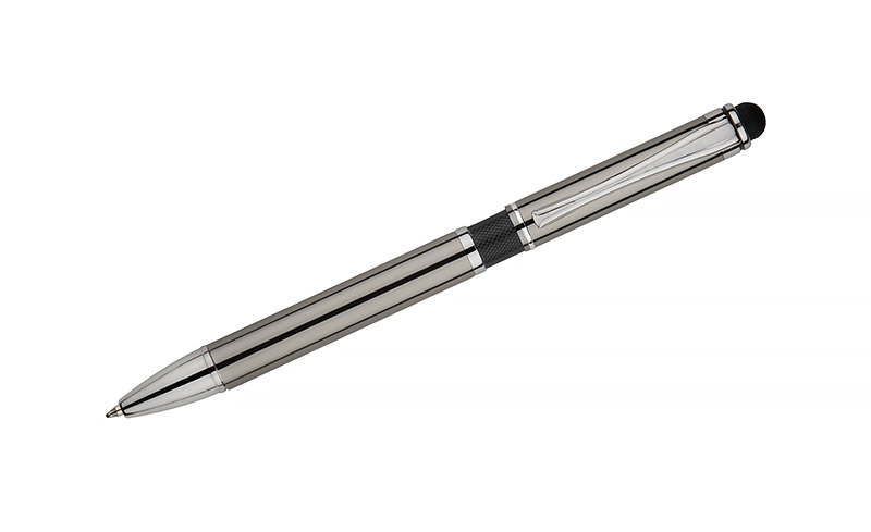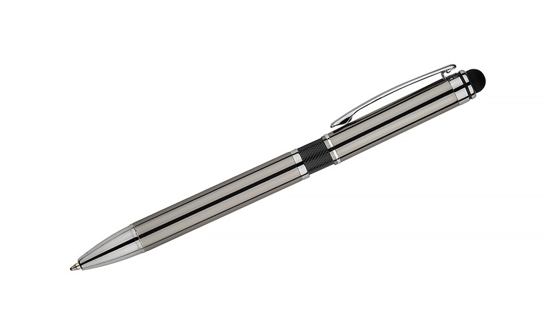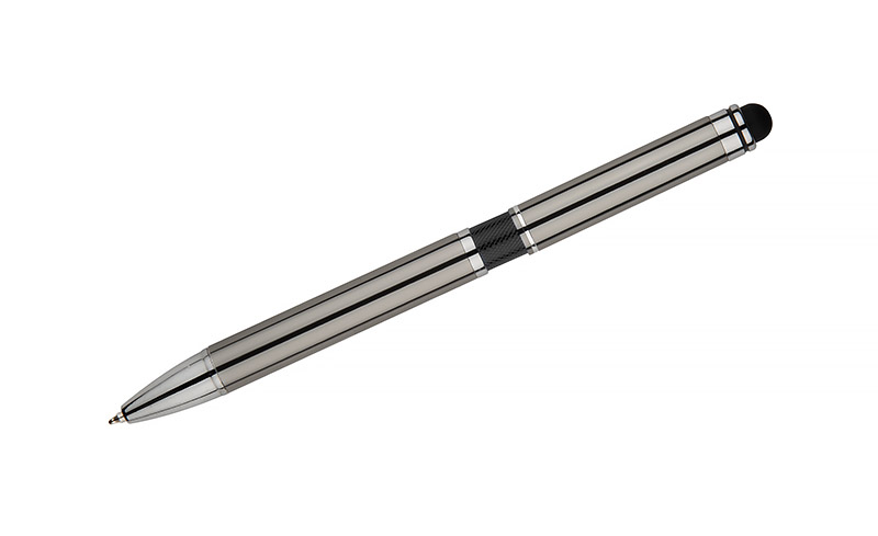 Elegant metal ball pen with colored bar and a touch pen.
