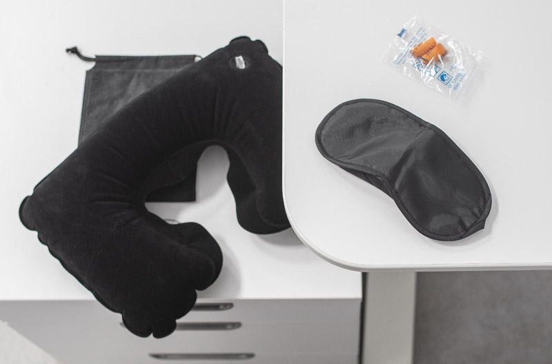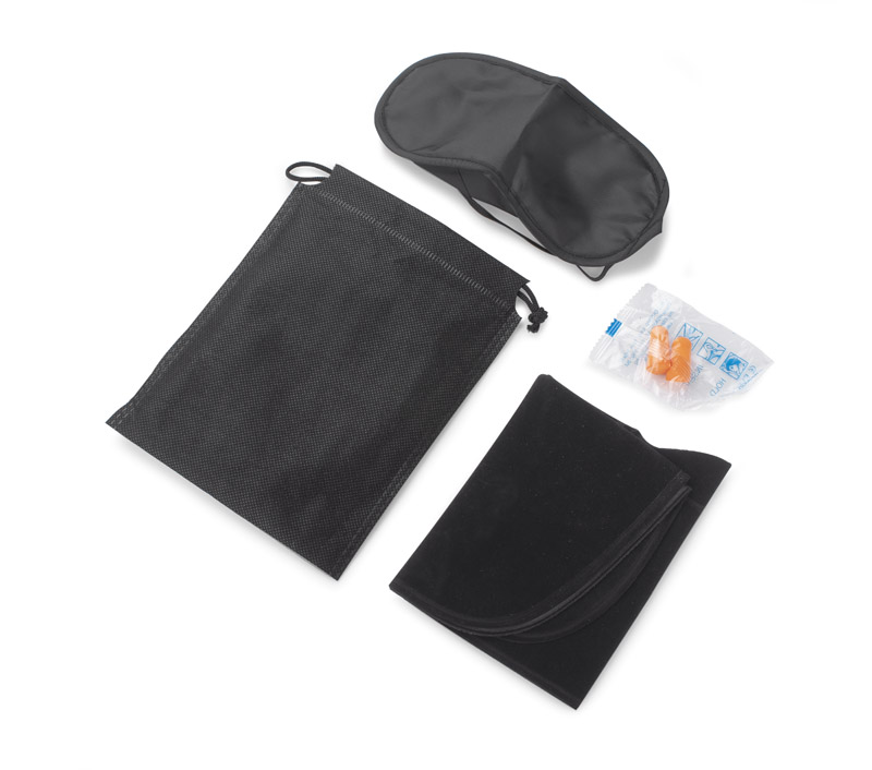 Trīs daļu komplekts ērtiem braucieniem: miega maska, ausu aizbāžņi un piepūšams spilvens ar mīkstu pārklājumu. Iepakots praktiskā melnā maisiņā.