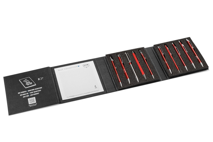 Stilīgs etvī ar 10 populārākajām metāla pildspalvām. Ietver akmens papīra blociņu testēšanai. Ideāls rīks pārdošanas prezentācijām.
