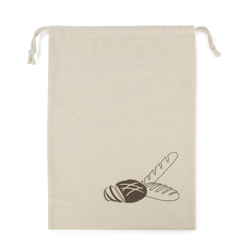 Augstas kvalitātes 120g/m2 kokvilnas maisiņš maizes uzglabāšanai. Dabīga smilškrāsa un speciāls grafisks dizains.