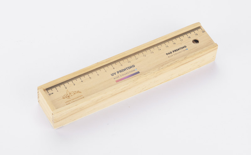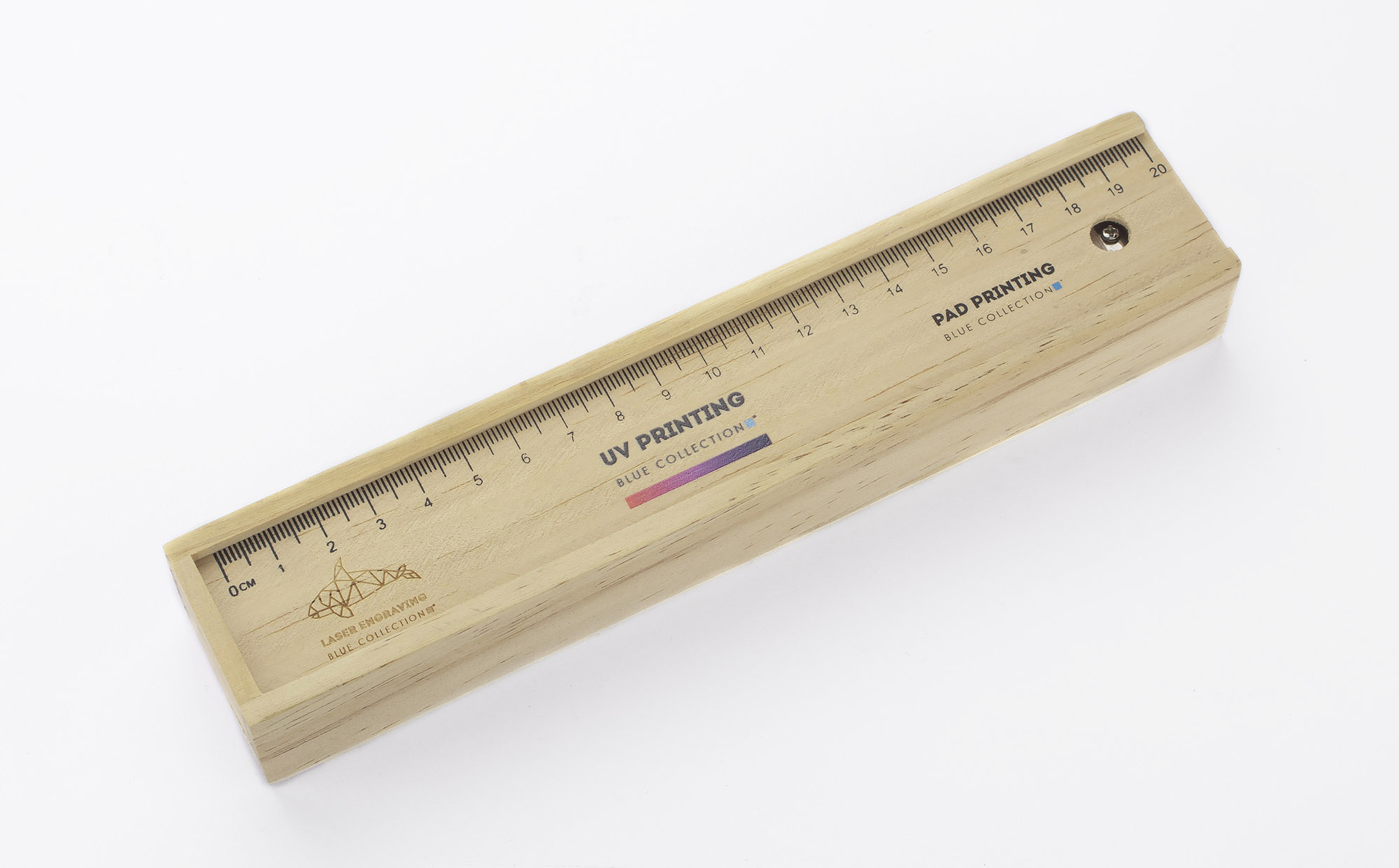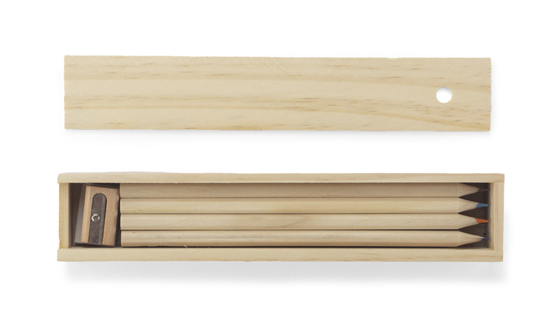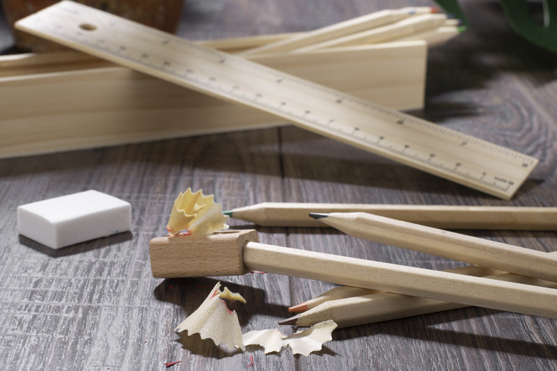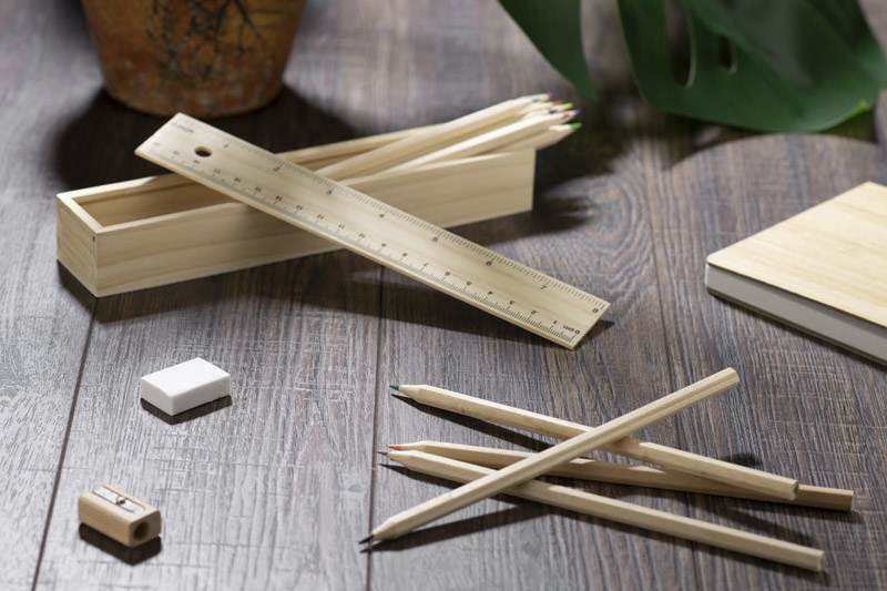 Koka kārbiņa, kurā ievietoti 12 dažādu krāsu zīmuļi, lineāls un dzēšgumija. Praktisks komplekts radošiem darbiem.