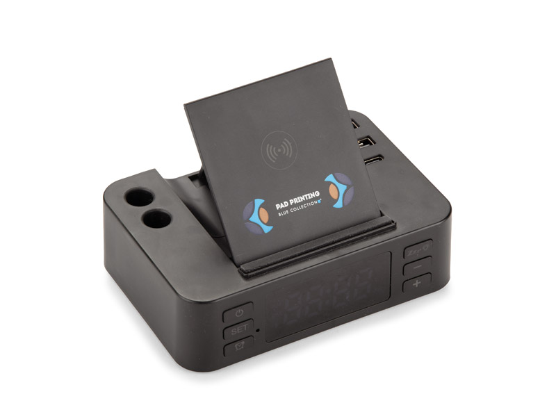 Daudzfunkcionāls pulkstenis: bezvadu uzlādes paliktnis (horizontalā/vertikālā pozīcijā), 3 USB pieslēgvietas (USB-A un USB-C) un divi nodalījumi piederumiem.