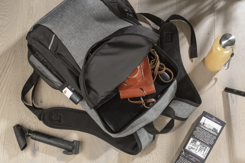 Videi draudzīga rPET poliestera mugursoma ar diviem galvenajiem nodalījumiem un vairākām priekšējām kabatām. Ūdensnecaurlaidīga PVC apakša un sānu tīkliņa kabatas pudelēm.