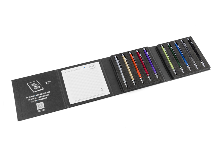 Elegants prezentācijas komplekts ar Blue Collection metāla pildspalvām un piezīmju bloku.