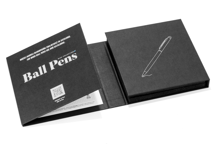 Mūsdienīgs futrālis ar 10 populārākajām Blue Collection metāla pildspalvām un akmens papīra piezīmju bloku testēšanai.