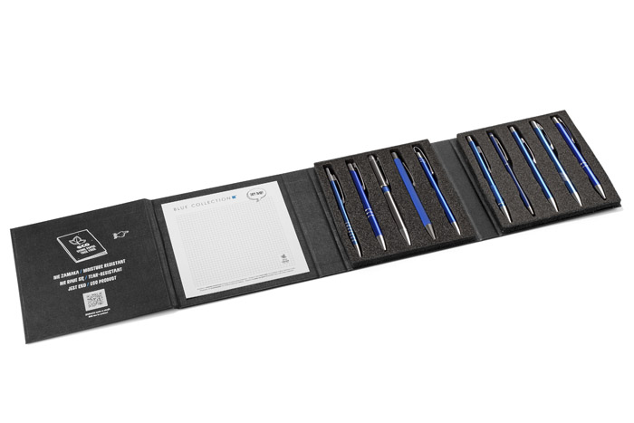 Moderns pildspalvu futrālis ar populārākajām kolekcijas pildspalvām un akmens papīra bloku. Ideāls prezentāciju rīks.